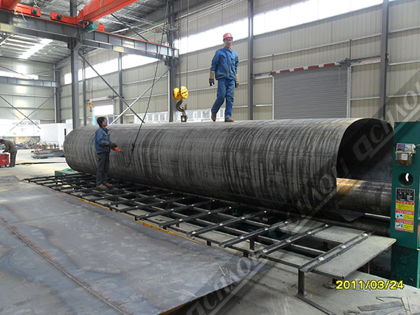 掛車用卷板機增加托輥及上輥撓曲補償可使筒件取得較好的直線度。可增加外托料架及內升料架使操作更便利,更少人工??膳浜锨昂蟮拦ば蜃魃a線優(yōu)化使用。