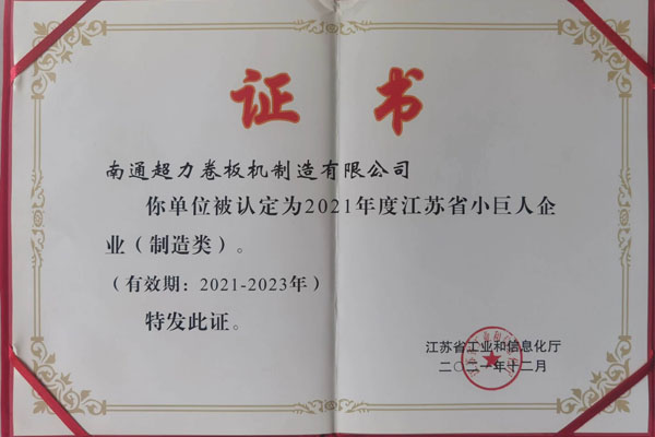 超力卷板機(jī)獲2021-2023年度江蘇省小巨人企業(yè)證書(shū)
